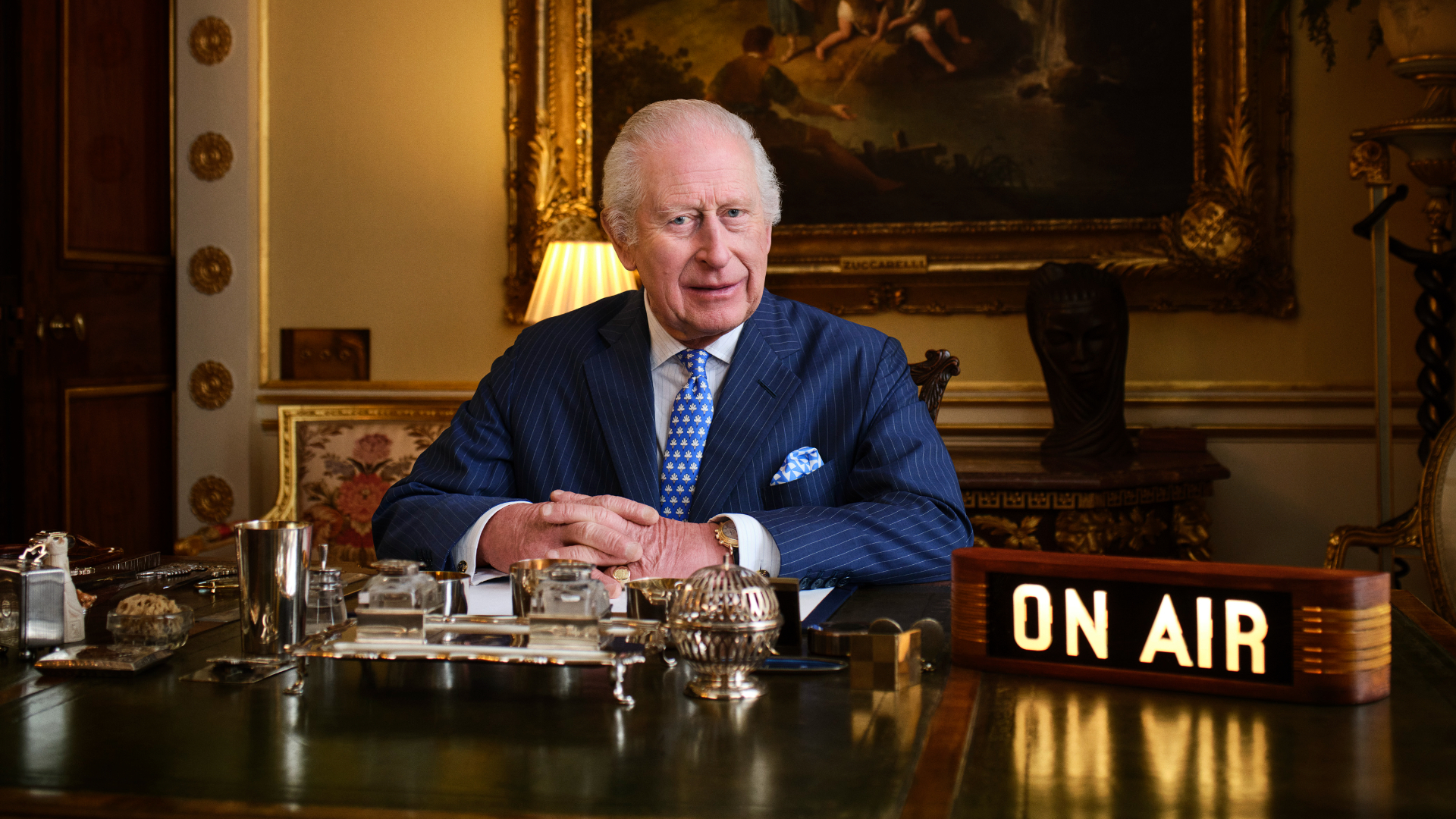 King Charles III photographed at Buckingham Palace for the King's Music Room, with an "on air" sign on the desk.