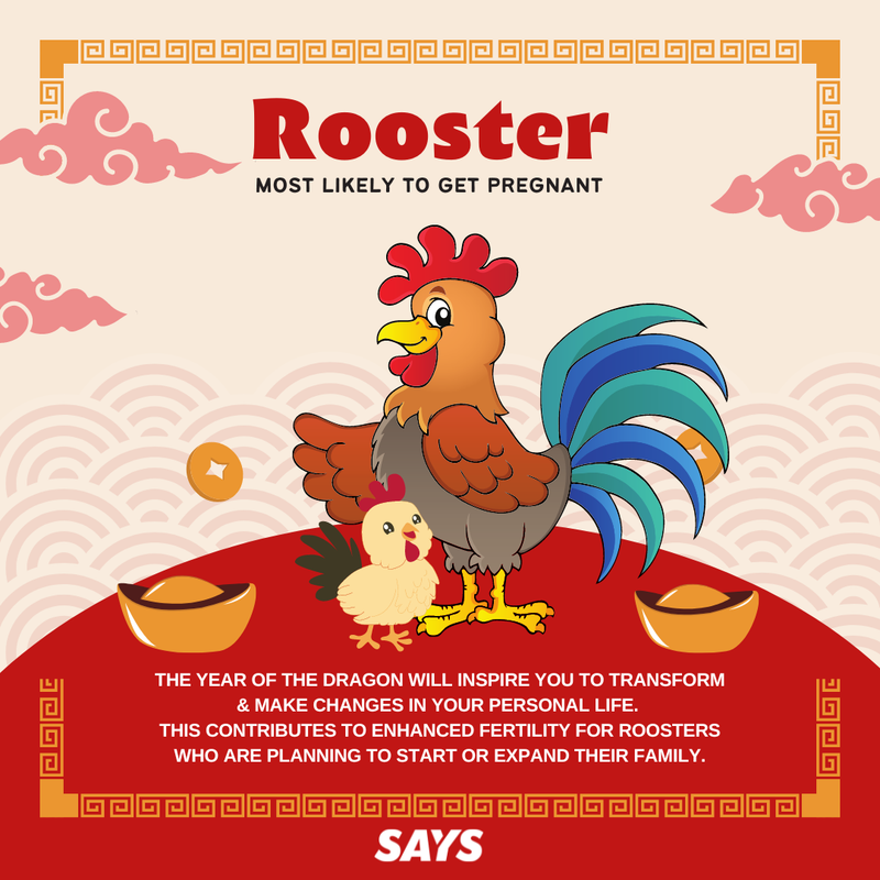 The Dragon will be a huge influence on Roosters this year, inspiring you to transform into your best self and make significant changes in your personal life. This contributes to enhanced fertility for Roosters who are planning to start or expand their family.