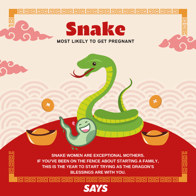 Snakes who have been thinking about growing their family will have the auspicious blessings for the Dragon on their side this year, and are one of the most prosperous zodiac signs. Snake women are said to be exceptional mothers, and tend to put a lot of thought into the timing of having children so that they can provide them with the best.