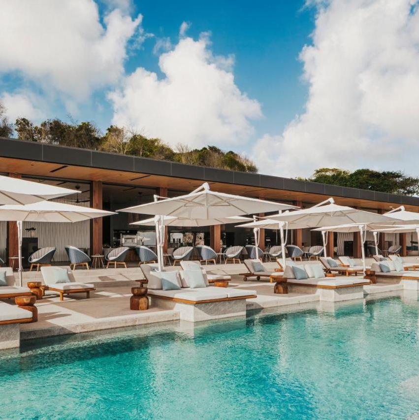 The property features five distinctive dining concepts, a chic beach club, and a bar that frames the coastline perfectly at golden hour