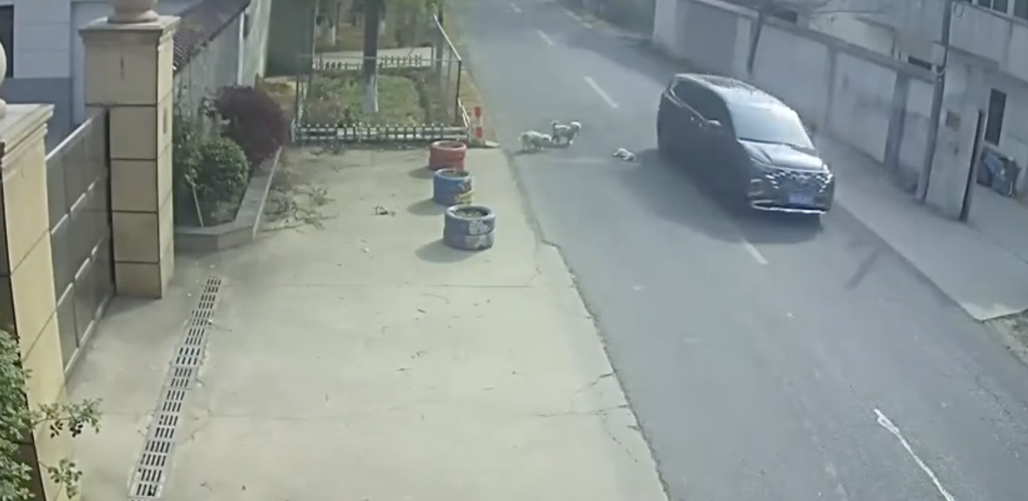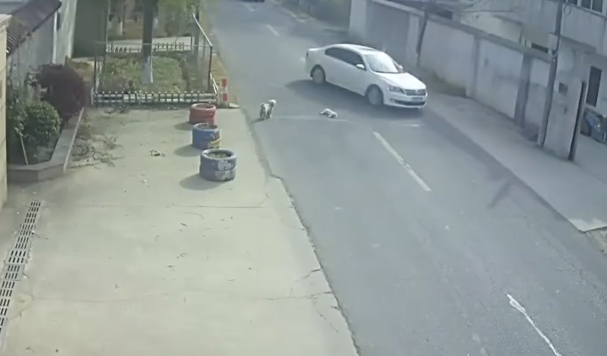 CCTV footage from 30 March shows a white dog attempting to cross a busy road before being struck by a passing vehicle. The poor pup collapses and lies motionless in the middle of traffic.