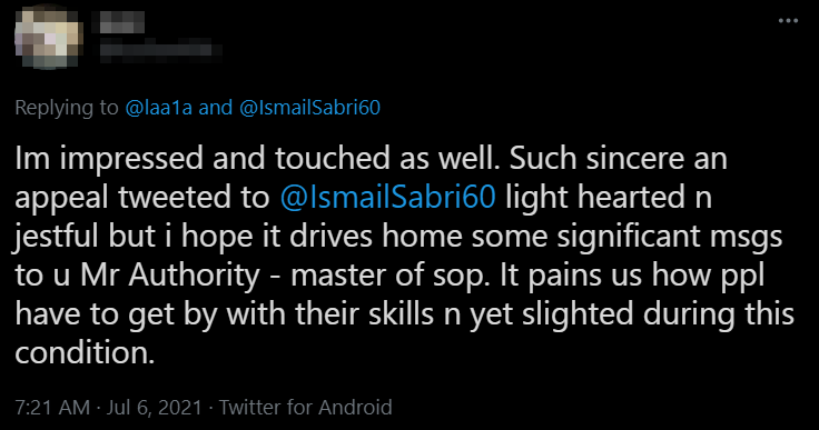 Another netizen said, "I'm impressed and touched as well. Such a sincere appeal tweeted to [Ismail Sabri]. Light hearted and jestful but I hope it drives home some significant messages to you, Mr. Authority โ master of SOP. It pains us how people have to get by with their skills and yet slighted during this condition."