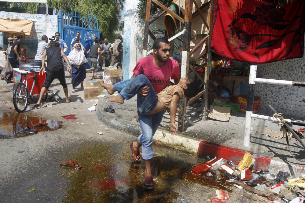 A Palestinian man carries an injured child following an Israeli military strike on a U.N. school in Rafah, in the southern Gaza Strip on Aug. 3, 2014