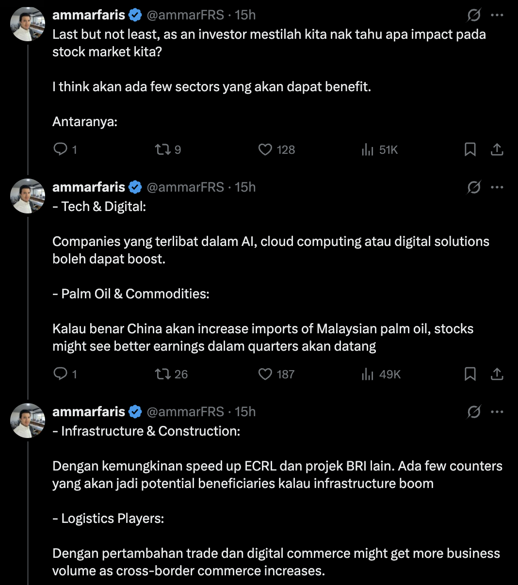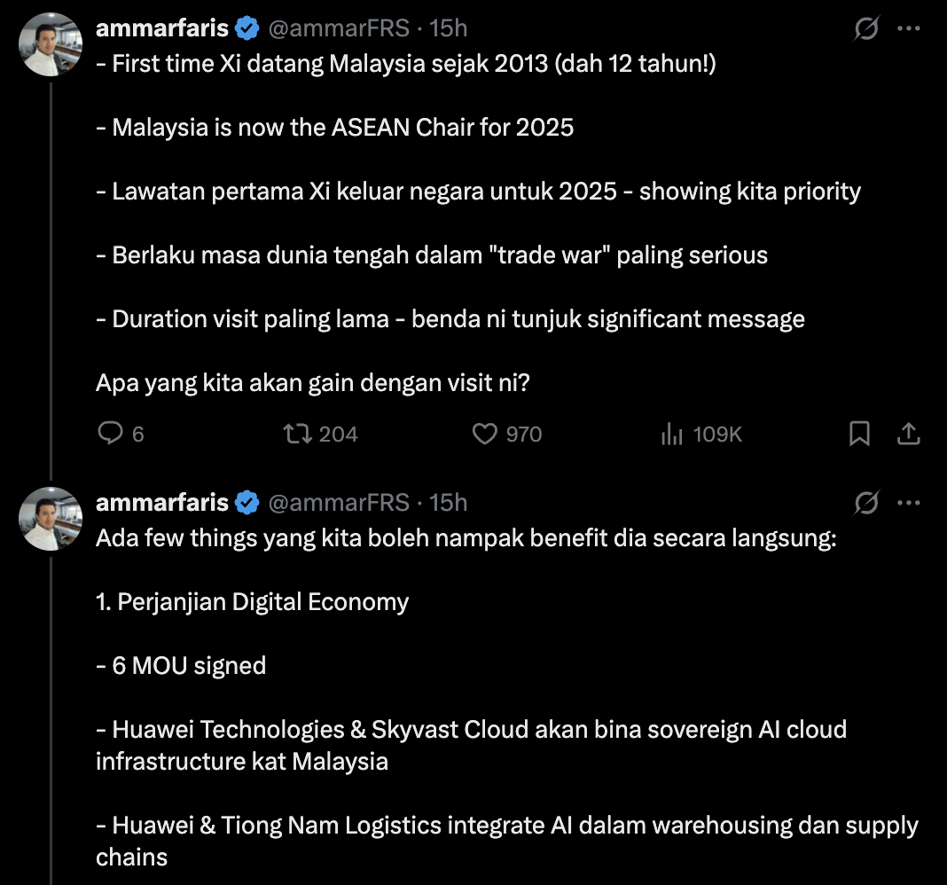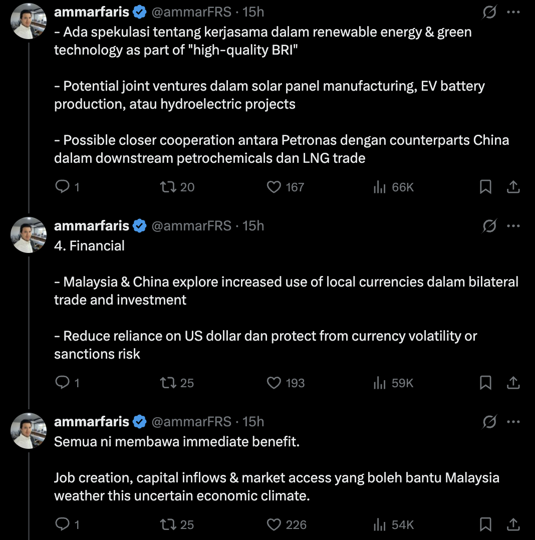 Seorang pengguna di laman X iaitu @ammarFRS berkongsi pendapatnya mengenai motif dan kepentingan lawatan negara China ke Malaysia.
