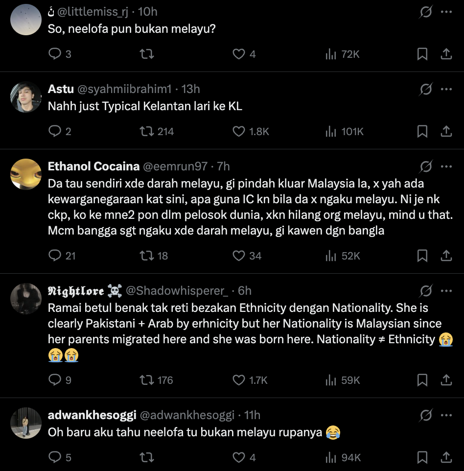 Malah, ada yang mempersoalkan jika Neelofa juga bukan berbangsa Melayu. Berikut adalah antara komen netizen di laman X:
