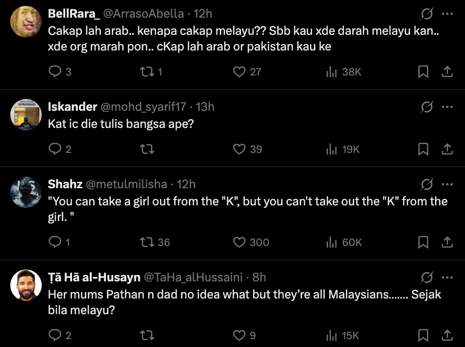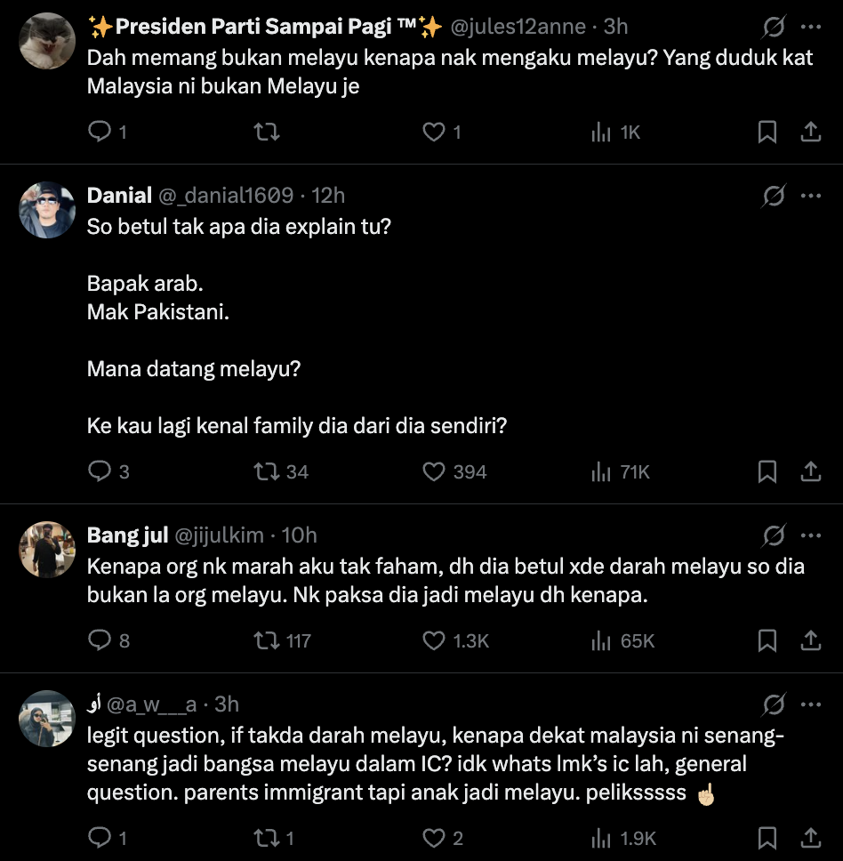 Sebuah ciapan di laman X berbunyi: "LMK tak mengaku dia melayu, so dia bangsa apa? Bangsa lupa diri?".