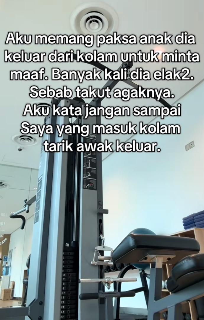"Aku pergi terus kat pool tanya anak siapa ni? Sorang akak tu jawab itu anak dia. Aku cakap sorry kak, saya kena ajar anak akak kurang ajar sangat tunjuk f*ck ni. Akak tu approve jelah," katanya.