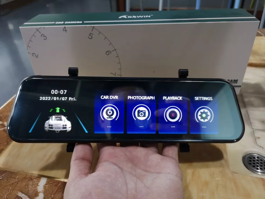 This Asawin 10-inch dashcam mirror functions as both a dashcam and a front mirror. It has a touchscreen function, where you can adjust different settings, as well as a 1080P resolution, recording both the rear and front view.